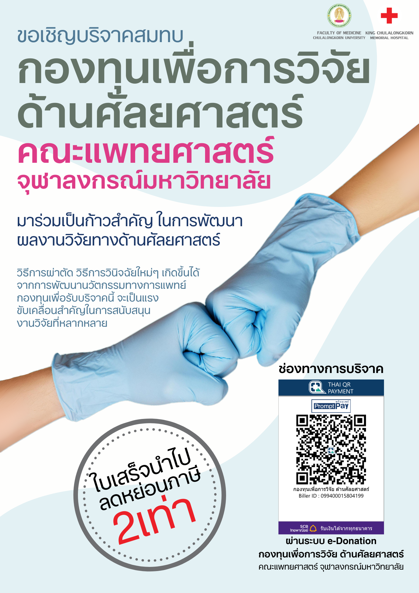 ขอเชิญชวนผู้มีจิตศรัทธา ผู้สนใจบริจาคเงินในช่วงปลายปี เพื่อการพัฒนางานวิจัยเพื่อการรักษาผู้ป่วยศัลยกรรม การพัฒนาองค์ความรู้ทางด้านศัลยศาสตร์ และเทคโนโลยีนวัตกรรมทางการแพทย์