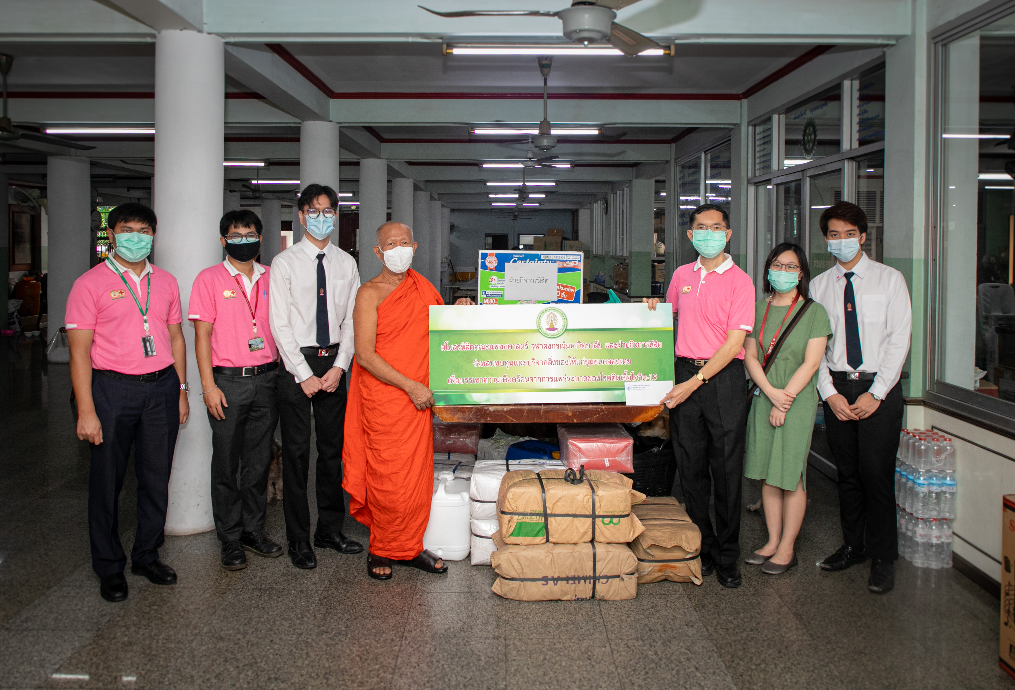ศ.ดร.นพ.สิทธิศักดิ์ หรรษาเวก รองคณบดีฝ่ายกิจการนิสิต คณะแพทยศาสตร์ จุฬาลงกรณ์มหาวิทยาลัย และ ผู้แทนนิสิต จากสโมสรนิสิตคณะแพทยศาสตร์ จุฬาลงกรณ์มหาวิทยาลัย ร่วมถวายปัจจัย จำนวน 59,583 บาท (ห้าหมื่นเก้าพันห้าร้อยแปดสิบสามบาทถ้วน) พร้อมด้วย อาหารแห้ง เจลแอลกอฮอล์ หน้ากากอนามัย และ ผ้าอ้อมผู้ใหญ่ ให้แก่ พระพิศาลธรรมานุสิฐ เจ้าสำนักปฏิบัติธรรมประจำกรุงเทพมหานคร แห่งที่ 18 เจ้าอาวาสวัดสะพาน เพื่อช่วยเหลือและบรรเทาความเดือดร้อนของผู้ติดเชื้อโรคโควิด-19 ในศูนย์กักตัวชั่วคราว ชุมชนคลองเตย กรุงเทพฯ