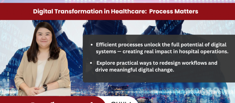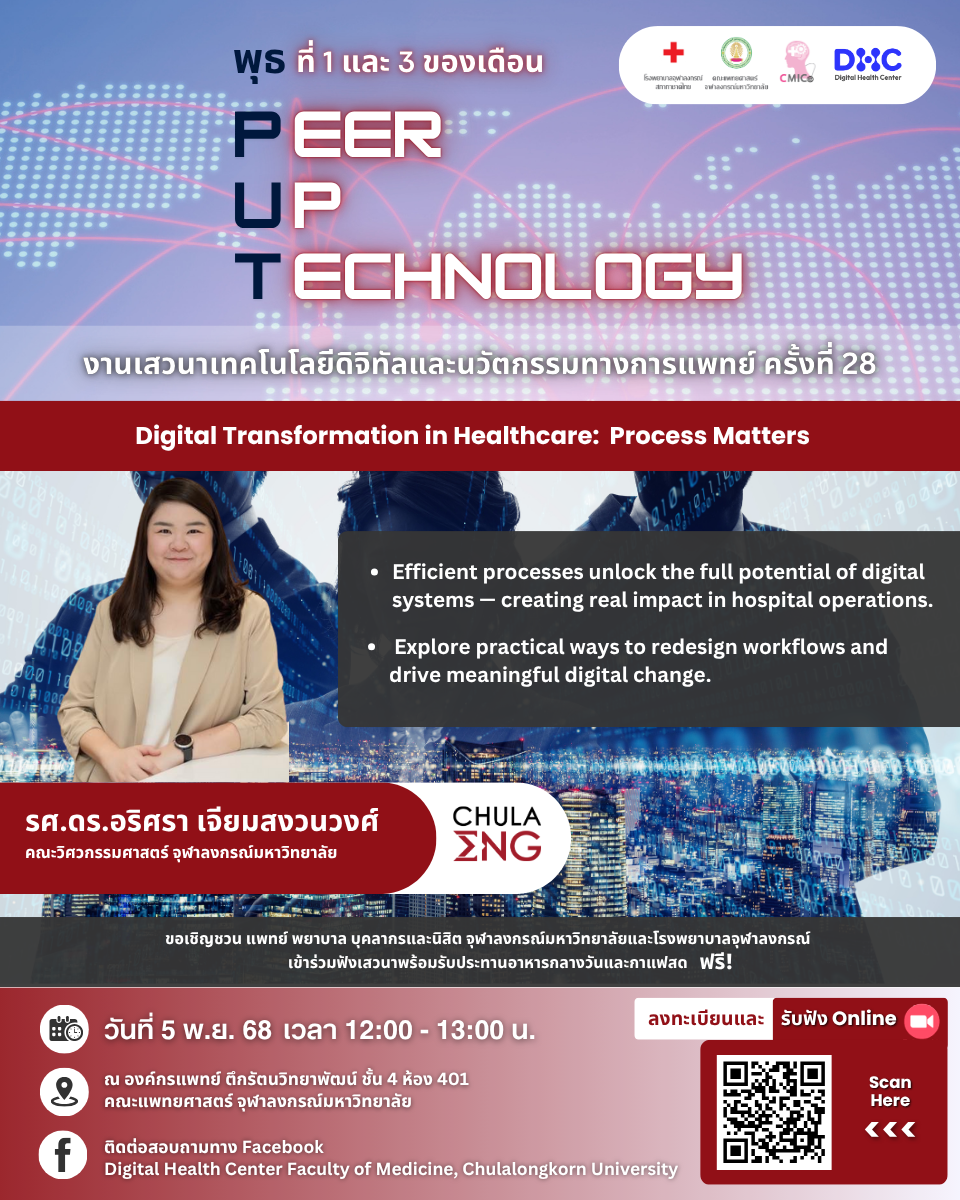 ขอเชิญผู้สนใจร่วมงานเสวนาเทคโนโลยีดิจิทัลนวัตกรรมทางการแพทย์ หัวข้อ Digital Transformation in Healthcare: Process Matters โดย รศ.ดร.อริศรา เจียมสงวนวงศ์ คณะวิศวกรรมศาสตร์ จุฬาลงกรณ์มหาวิทยาลัย