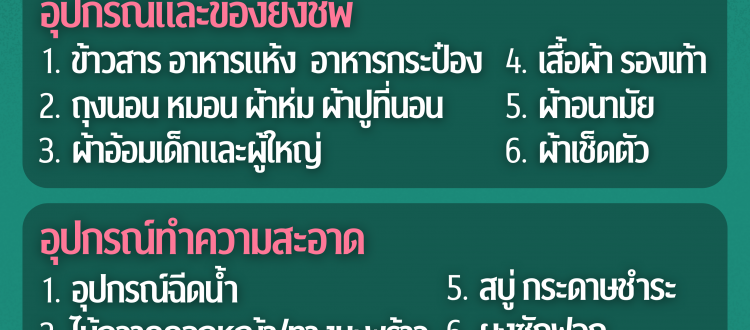 อุปกรณ์และของยังชีพ: ข้าวสาร อาหารแห้ง/กระป๋อง, เสื้อผ้า, ผ้าอ้อมเด็ก/ผู้ใหญ่, เครื่องนอน (ถุงนอน, หมอน, ผ้าห่ม), ผ้าเช็ดตัว, ผ้าอนามัย