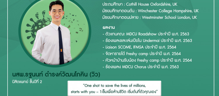 “It is an honour for me to be able to be a part of the King Chulalongkorn Memorial Hospital and the Thai RedCross Society once again.I have always appreciated all the selfless projects that this institution had conducted in the past, and the way it wholeheartedly dedicates itself for the public. Despite beinga first year medical student, I still strongly believe that I have a social responsibility to assist those in need as I am already a part of the medical healthcare profession. Therefore, I am very happy to be able to help and raise funds for the COVID-19 vaccine research project in Thailand. I hope that my contribution will improve the quality of life for all, to help our society be capable of sustaining itself through these dark times of a pandemic, and also encourage and inspire others to stand up and make a change for our country. One shot to save millions of lives, start with you.”