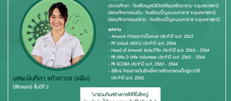 ทูตน้ำใจ พรีเซนเตอร์เข็มวันอานันทมหิดล 2564 นสพ.นันทิดา แก้วถาวร (แฟ้ม) นิสิตแพทย์ ชั้นปีที่ 2