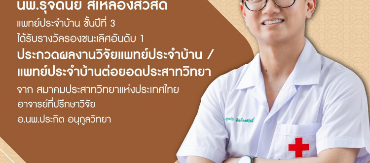 นพ.รุจดนัย สีเหลืองสวัสดิ์ แพทย์ประจำบ้าน ชั้นปีที่ 3 ได้รับรางวัลรองชนะเลิศอันดับ 1 ประกวดผลงานวิจัยแพทย์ประจำบ้าน/แพทย์ประจำบ้านต่อยอดประสาทวิทยา (เกียรติภูมิแพทย์จุฬาฯ)