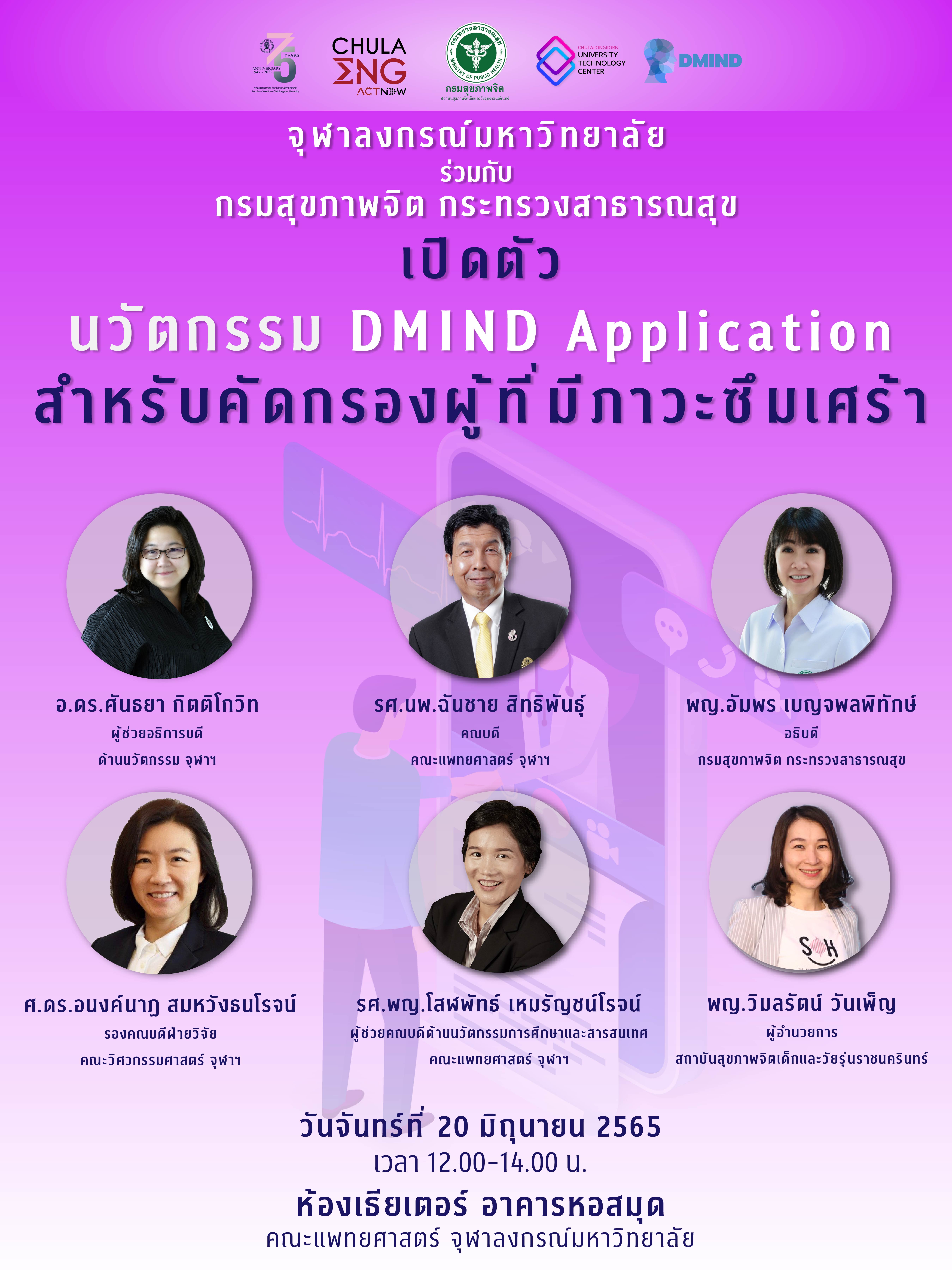 16 มิ.ย. 2022 จุฬาลงกรณ์มหาวิทยาลัย ร่วมกับ กรมสุขภาพจิต กระทรวงสาธารณสุข เปิดตัว “นวัตกรรม DMIND Application สำหรับคัดกรองผู้ที่มีภาวะซึมเศร้า” /Tags#mdcu, chula, chulalongkorn, innovation, medicine, คณะแพทยศาสตร์จุฬาลงกรณ์มหาวิทยาลัย, คณะแพทยศาสตร์จุฬาฯ, คณะแพทย์จุฬาฯ, แพทย์จุฬาฯ กลับไปหน้าข่าวประชาสัมพันธ์