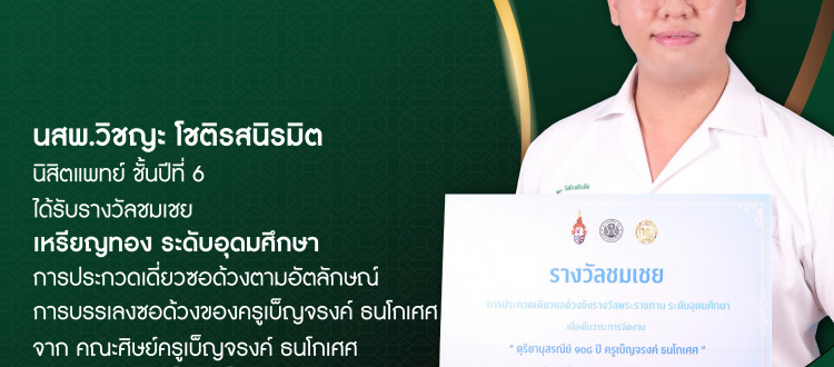 18 พ.ย. 2025 นสพ.วิชญะ โชติรสนิรมิต นิสิตแพทย์ ชั้นปีที่ 6 ได้รับรางวัลชมเชย เหรียญทอง ระดับอุดมศึกษา การประกวดเดี่ยวซอด้วงตามอัตลักษณ์การบรรเลงซอด้วงของครูเบ็ญจรงค์ ธนโกเศศ (เกียรติภูมิแพทย์จุฬาฯ) /Tags#mdcu, chula, chulalongkorn, medicine, คณะแพทยศาสตร์จุฬาลงกรณ์มหาวิทยาลัย, คณะแพทยศาสตร์จุฬาฯ, คณะแพทย์จุฬาฯ, เกียรติภูมิแพทย์จุฬาฯ, แพทย์จุฬาฯ กลับไปหน้าข่าวประชาสัมพันธ์