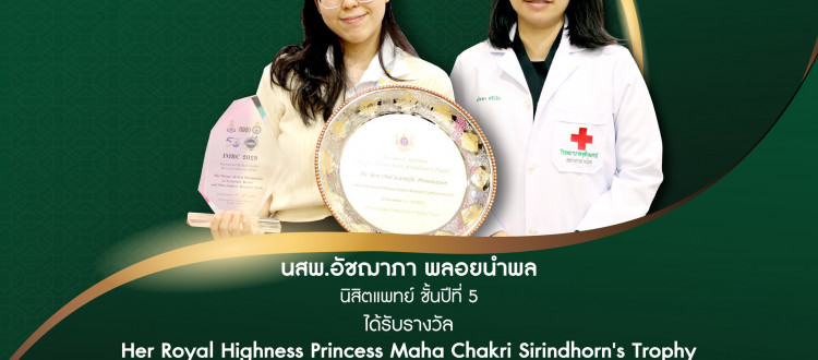 26 ธ.ค. 2025 นสพ.อัชฌาภา พลอยนำพล นิสิตแพทย์ ชั้นปีที่ 5 ได้รับรางวัล Her Royal Highness Princess Maha Chakri Sirindhorn’s Trophy และ รางวัลชนะเลิศ Oral Presentation Systematic Review and Meta-analysis Research Track (เกียรติภูมิแพทย์จุฬาฯ)) /Tags#mdcu, chula, chulalongkorn, medicine, คณะแพทยศาสตร์จุฬาลงกรณ์มหาวิทยาลัย, คณะแพทยศาสตร์จุฬาฯ, คณะแพทย์จุฬาฯ, เกียรติภูมิแพทย์จุฬาฯ, แพทย์จุฬาฯ กลับไปหน้าข่าวประชาสัมพันธ์