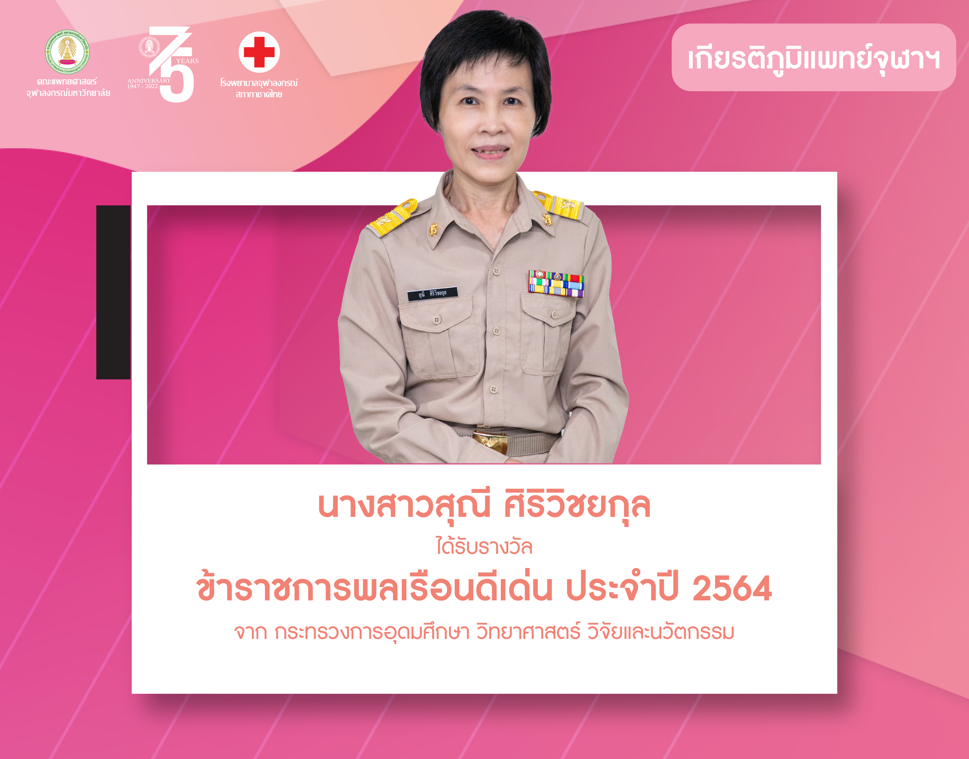 10 พ.ค. 2022 นางสาวสุณี ศิริวิชยกุล ได้รับรางวัล ข้าราชการพลเรือนดีเด่น ประจำปี 2564 จากกระการอุดมศึกษา วิทยาศาสตร์ วิจัยและนวัตกรรม /Tags#mdcu, chula, chulalongkorn, medicine, คณะแพทยศาสตร์จุฬาลงกรณ์มหาวิทยาลัย, คณะแพทยศาสตร์จุฬาฯ, คณะแพทย์จุฬาฯ, เกียรติภูมิแพทย์จุฬาฯ, แพทย์จุฬาฯ กลับไปหน้าข่าวประชาสัมพันธ์