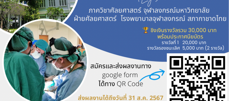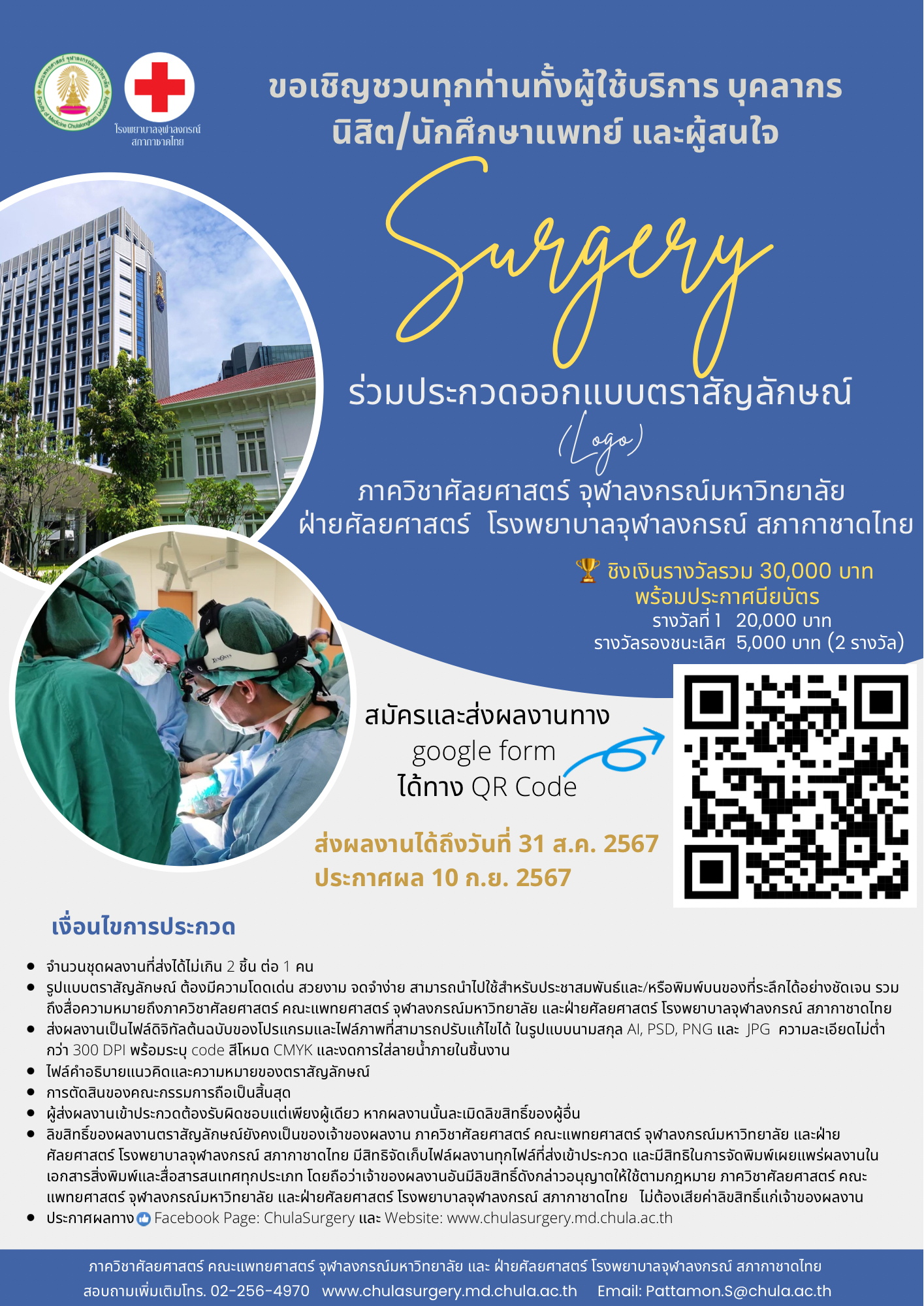 31 ก.ค. 2024 ขอเชิญชวนแพทย์ บุคลากร และผู้สนใจประกวดออกแบบตราสัญลักษณ์ (Logo) ภาควิชาศัลยศาสตร์ คณะแพทยศาสตร์ จุฬาลงกรณ์มหาวิทยาลัย และฝ่ายศัลยศาสตร์ โรงพยาบาลจุฬาลงกรณ์ สภากาชาดไทย กลับไปหน้าข่าวประชาสัมพันธ์
