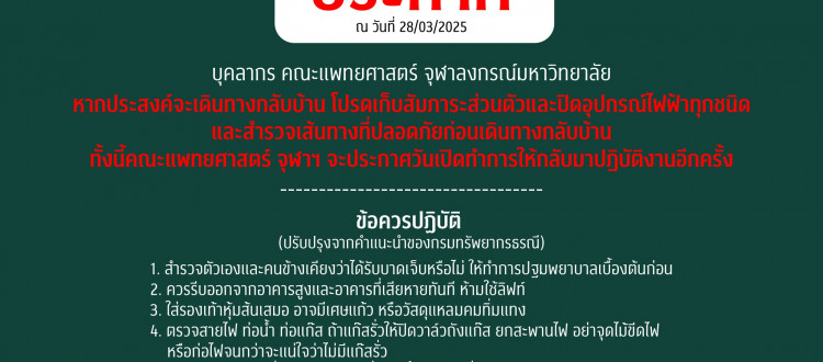 21 มิ.ย. 2025 ประกาศ!! 28 มีนาคม 2568 (เหตุแผ่นดินไหว) /Tags#mdcu, chula, chulalongkorn, medicine, คณะแพทยศาสตร์จุฬาลงกรณ์มหาวิทยาลัย, คณะแพทยศาสตร์จุฬาฯ, คณะแพทย์จุฬาฯ, แพทย์จุฬาฯ กลับไปหน้าข่าวประชาสัมพันธ์