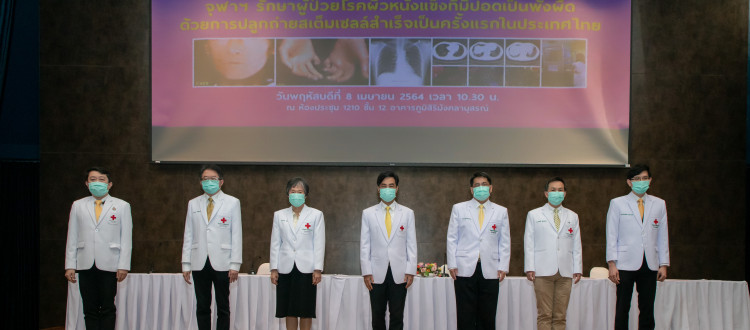 โดยในวันนี้ได้มีอีกผลงานที่น่ายินดีอย่างยิ่ง ซึ่งสาขาวิชาโรคข้อและรูมาติสซั่ม ภาควิชาอายุรศาสตร์ คณะแพทยศาสตร์ จุฬาลงกรณ์มหาวิทยาลัย และโรงพยาบาลจุฬาลงกรณ์ สภากาชาดไทย ได้ร่วมมือกับ สาขาโลหิตวิทยา สาขาวิชาระบบหายใจและเวชบำบัดวิกฤติโรคระบบการหายใจ และสาขาวิชาโรคติดเชื้อ ร่วมกันรักษาพยาบาลผู้ป่วย จำนวน 2 ราย ที่มีปัญหาผิวหนังแข็งและปอดเป็นพังผืด (systemic sclerosis with interstitial lung disease) ด้วยการปลูกถ่ายสเต็มเซลล์สำเร็จเป็นครั้งแรกของประเทศไทย แสดงให้เห็นถึงความรู้ความสามารถ ความเชี่ยวชาญเฉพาะทาง และความทุ่มเทของบุคลากรทางการแพทย์ที่นำเอาองค์ความรู้ และการศึกษาวิจัยรวมทั้งเทคโนโลยีทางการแพทย์เกี่ยวกับสเต็มเซลล์มาใช้ เพื่อให้ผู้ป่วยให้มีสุขภาพชีวิตที่ดีขึ้น