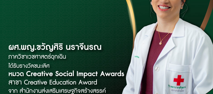 17 ต.ค. 2025 ผศ.พญ.ขวัญศิริ นราจีนรณ ภาควิชาเวชศาสตร์ฉุกเฉิน ได้รับรางวัลชนะเลิศ หมวด Creative Social Impact Awards สาขา Creative Education Award /Tags#mdcu, chula, chulalongkorn, medicine, คณะแพทยศาสตร์จุฬาลงกรณ์มหาวิทยาลัย, คณะแพทยศาสตร์จุฬาฯ, คณะแพทย์จุฬาฯ, เกียรติภูมิแพทย์จุฬาฯ, แพทย์จุฬาฯ กลับไปหน้าข่าวประชาสัมพันธ์