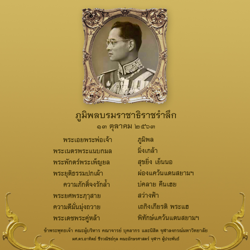13 ต.ค. 2020 ภูมิพลบรมราชาธิราชรำลึก 13 ตุลาคม 2563 /Tags#mdcu, chula, chulalongkorn, medicine, คณะแพทยศาสตร์จุฬาลงกรณ์มหาวิทยาลัย, คณะแพทยศาสตร์จุฬาฯ, คณะแพทย์จุฬาฯ, แพทย์จุฬาฯ กลับไปหน้าข่าวประชาสัมพันธ์