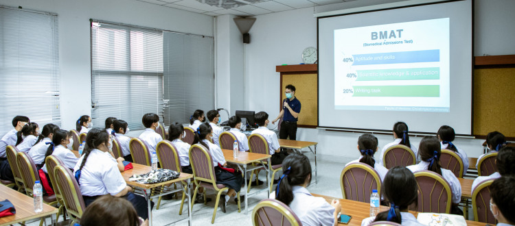 ผศ.นพ.เสกข์ แทนประเสริฐสุข ผู้ช่วยคณบดีฝ่ายกิจการนิสิต คณะแพทยศาสตร์ จุฬาลงกรณ์มหาวิทยาลัย กล่าวต้อนรับคณาจารย์ และคณะนักเรียนระดับชั้นมัธยมศึกษาปีที่ 4-5 แผนการเรียนเตรียมแพทย์ จำนวน 55 คน จากโรงเรียนจันทร์ประดิษฐาราม เขตภาษีเจริญ กรุงเทพฯ เนื่องในโอกาสเข้าฟังแนะแนวการศึกษาต่อในหลักสูตรแพทยศาสตรบัณฑิต คณะแพทยศาสตร์ จุฬาลงกรณ์มหาวิทยาลัย พร้อมทั้งไปศึกษาเรียนรู้ร่างอาจารย์ใหญ่ ภาควิชากายวิภาคศาสตร์ โดยมี นพ.ณวัชร ณ ตะกั่วทุ่ง และ นพ.กวิน อธิภาส แพทย์ช่วยสอน ภาควิชากายวิภาคศาสตร์ คณะแพทยศาสตร์ จุฬาลงกรณ์มหาวิทยาลัย ร่วมต้อนรับ