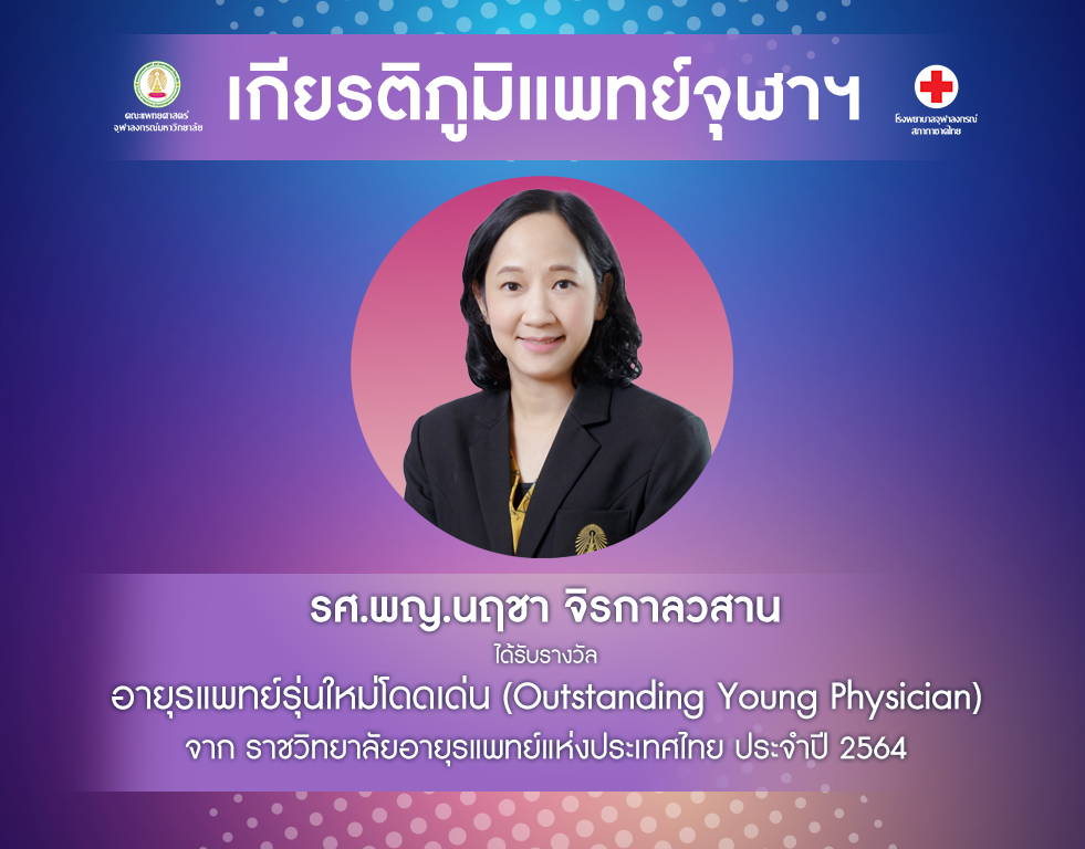 5 ต.ค. 2021 รศ.พญ.นฤชา จิรกาลวสาน ได้รับรางวัล อายุรแพทย์รุ่นใหม่โดดเด่น (Outstanding Young Physician) จากราชวิทยาลัยอายุรแพทย์แห่งประเทศไทย ประจำปี 2564 /Tags#mdcu, chula, chulalongkorn, medicine, คณะแพทยศาสตร์จุฬาลงกรณ์มหาวิทยาลัย, คณะแพทยศาสตร์จุฬาฯ, คณะแพทย์จุฬาฯ, เกียรติภูมิแพทย์จุฬาฯ, แพทย์จุฬาฯ กลับไปหน้าข่าวประชาสัมพันธ์