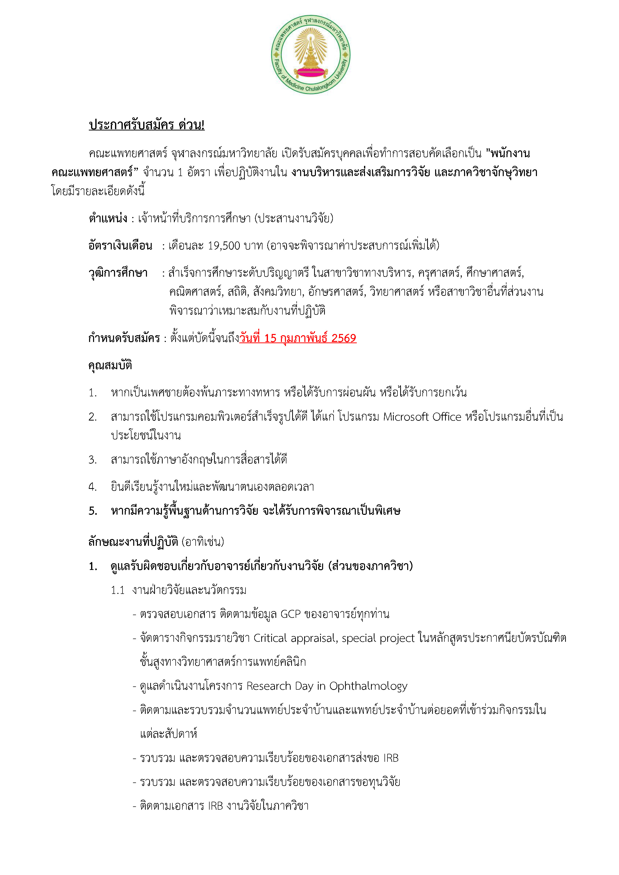 10 ก.พ. 2026 📝ประกาศ #รับสมัครงาน พนักงานคณะแพทยศาสตร์ จุฬาลงกรณ์มหาวิทยาลัย✨️(งานบริหารและส่งเสริมการวิจัย และภาควิชาจักษุวิทยา) /Tags#mdcu, chula, chulalongkorn, medicine, คณะแพทยศาสตร์จุฬาลงกรณ์มหาวิทยาลัย, คณะแพทยศาสตร์จุฬาฯ, คณะแพทย์จุฬาฯ, ประกาศรับสมัครงาน, สมัครงาน, แพทย์จุฬาฯ ประกาศรับสมัครจักษุ (5-2-69) - ว่าที่ร้อยตรีเจษ_Page_1 ประกาศรับสมัครจักษุ (5-2-69) - ว่าที่ร้อยตรีเจษ_Page_2 ประกาศรับสมัครจักษุ (5-2-69) - ว่าที่ร้อยตรีเจษ_Page_3 กลับไปหน้าข่าวประชาสัมพันธ์