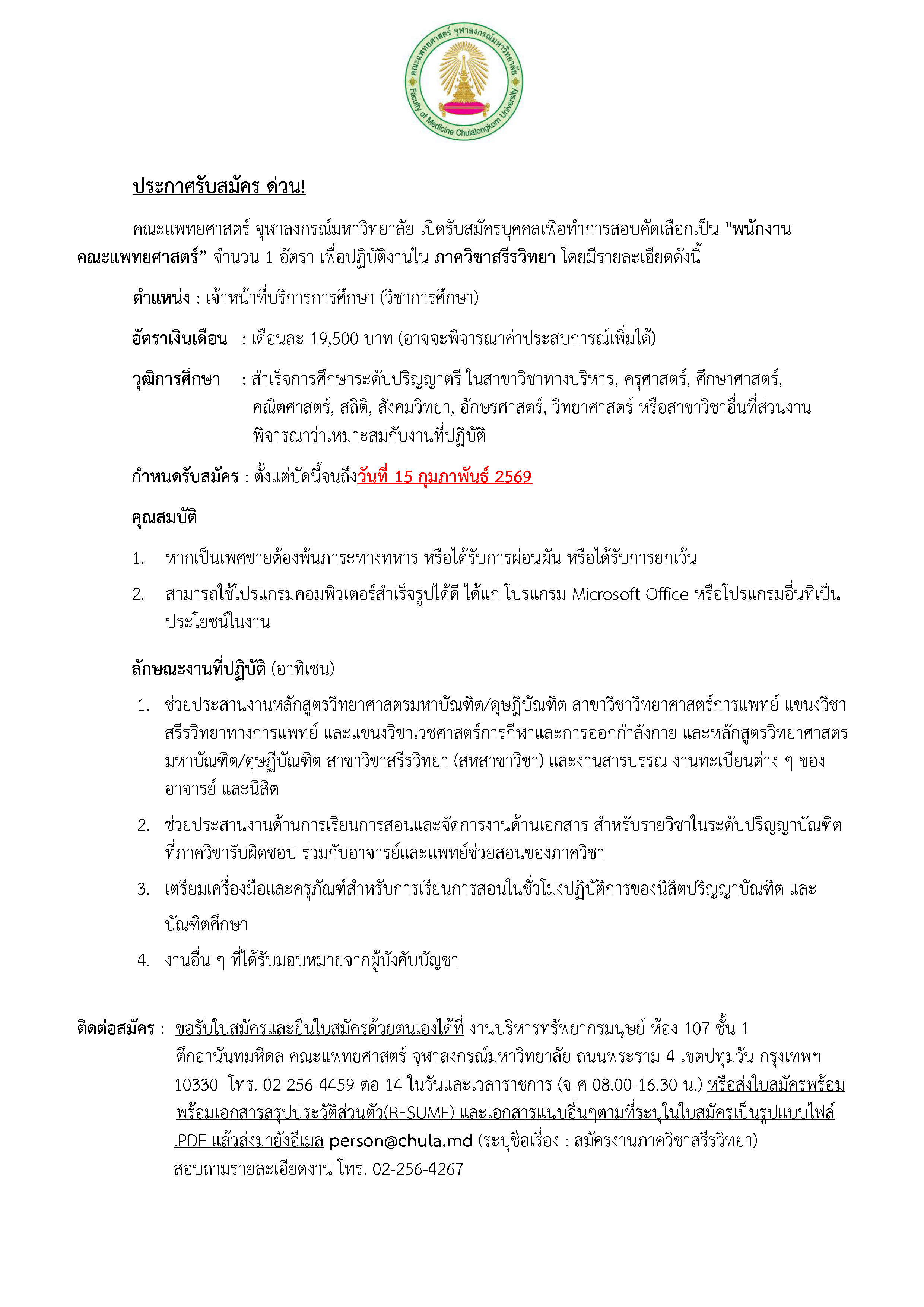 📝ประกาศ #รับสมัครงาน พนักงานคณะแพทยศาสตร์ จุฬาลงกรณ์มหาวิทยาลัย✨️ (ภาควิชาสรีรวิทยา)