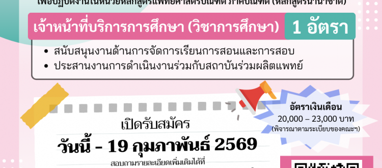 📣(รับสมัครด่วน) วันนี้ – 19 กุมภาพันธ์ 2569 เปิดรับสมัครพนักงานวิสามัญ ตำแหน่ง “เจ้าหน้าที่บริการการศึกษา (วิชาการศึกษา)”