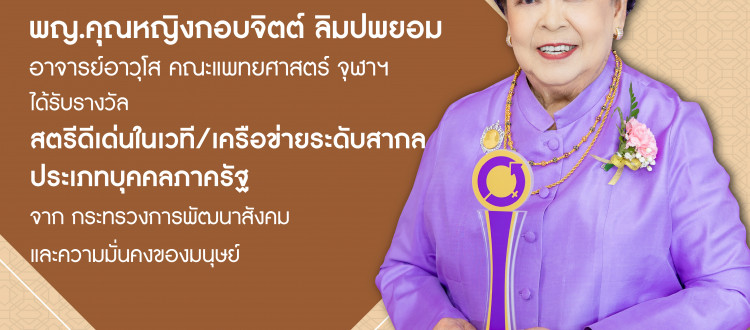 21 มิ.ย. 2025 ศ.กิตติคุณ พญ.คุณหญิงกอบจิตต์ ลิมปพยอม อาจารย์อาวุโส คณะแพทยศาสตร์ จุฬาฯ ได้รับรางวัลสตรีดีเด่นในเวที/เครือข่ายระดับสากล ประเภทบุคคลภาครัฐ (เกียรติภูมิแพทย์จุฬาฯ) /Tags#mdcu, chula, chulalongkorn, medicine, คณะแพทยศาสตร์จุฬาลงกรณ์มหาวิทยาลัย, คณะแพทยศาสตร์จุฬาฯ, คณะแพทย์จุฬาฯ, เกียรติภูมิแพทย์จุฬาฯ, แพทย์จุฬาฯ กลับไปหน้าข่าวประชาสัมพันธ์