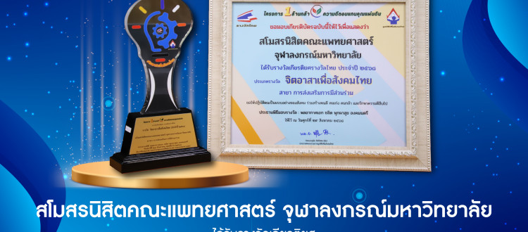 3 ต.ค. 2025 สโมสรนิสิตคณะแพทยศาสตร์ จุฬาลงกรณ์มหาวิทยาลัย ได้รับรางวัลเกียรติยศ “รางวัลไทย” ประจำปี 2568 ประเภทรางวัลจิตอาสาเพื่อสังคมไทย สาขาการส่งเสริมการมีส่วนร่วม จากมูลนิธิเพื่อสังคมไทย /Tags#mdcu, chula, chulalongkorn, medicine, คณะแพทยศาสตร์จุฬาลงกรณ์มหาวิทยาลัย, คณะแพทยศาสตร์จุฬาฯ, คณะแพทย์จุฬาฯ, เกียรติภูมิแพทย์จุฬาฯ, แพทย์จุฬาฯ กลับไปหน้าข่าวประชาสัมพันธ์