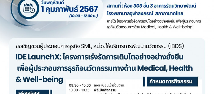 ขอเชิญชวนผู้ประกอบการธุรกิจ SML, หน่วยให้บริการการพัฒนานวัตกรรม (iBDS), อาจารย์ นักวิจัย จุฬาลงกรณ์มหาวิทยาลัย และผู้ที่สนใจ เข้าร่วมกิจกรรมเปิดตัว “IDE LaunchX: โครงการเร่งรัดการเติบโตอย่างอย่างยั่งยืน เพื่อผู้ประกอบการธุรกิจนวัตกรรมทางด้าน Medical, Health & Well-being” วันพฤหัสบดี ที่ 1 กุมภาพันธ์ พ.ศ. 2567 เวลา 10.00 – 12.00 น. ณ ห้อง 303 ชั้น 3 อาคารอาคารรัตนวิทยาพัฒน์ โรงพยาบาลจุฬาลงกรณ์ สภากาชาดไทย