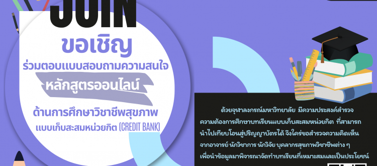 ร่วมตอบแบบสอบถามความสนใจ หลักสูตรออนไลน์ ด้านการศึกษาวิชาชีพสุขภาพ แบบเก็บสะสมหน่วยกิต (CREDIT BANK)