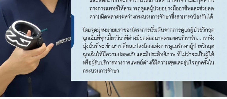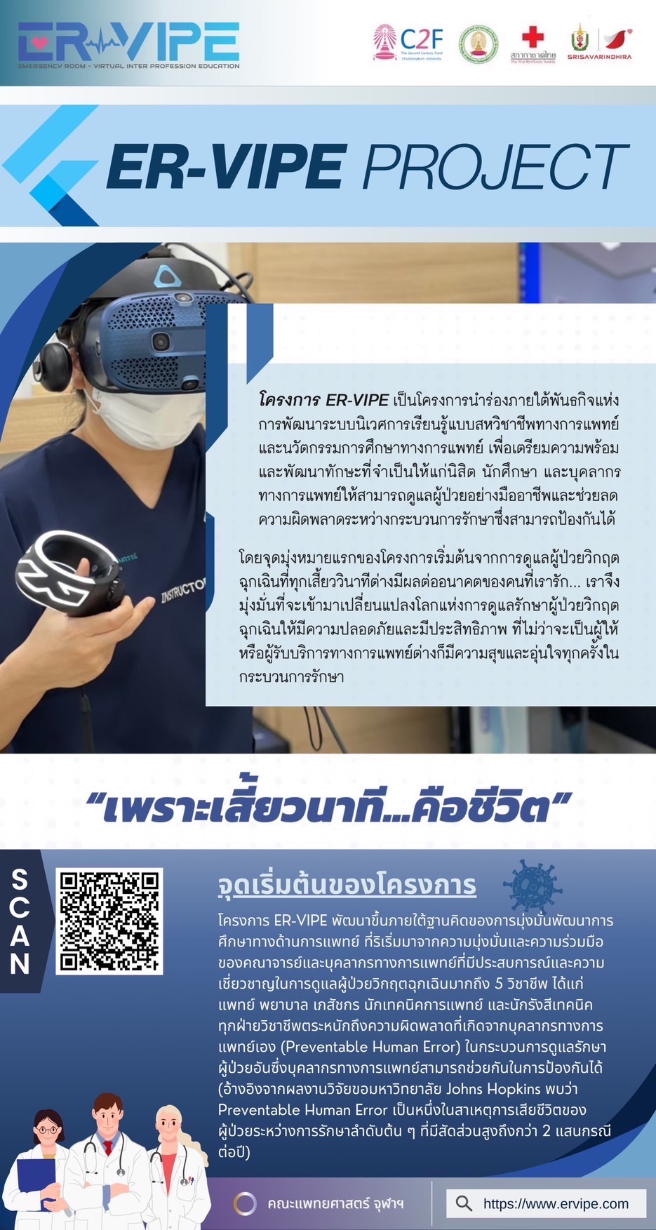ร่วมสนับสนุนโครงการ การศึกษารูปแบบใหม่ “ER-VIPE” โครงการวิจัยเพื่อพัฒนานวัตกรรมการเรียนรู้ ที่จะช่วยเพิ่มศักยภาพในการรักษาพยาบาลด้วยการใช้เทคโนโลยี virtual reality ในการฝึกอบรมระหว่างบุคลากรทางการแพทย์ 5 สาขาวิชาชีพ (แพทยศาสตร์ พยาบาลศาสตร์ เภสัชศาสตร์ เทคนิคการแพทย์ และรังสีเทคนิค) พัฒนาทักษะในการทำงานและการสื่อสาร โดยเฉพาะในสถานการณ์ฉุกเฉิน เพิ่มโอกาสให้ผู้ป่วยหลายชีวิต 🏥