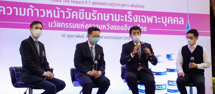 จุฬาลงกรณ์มหาวิทยาลัย และ คณะแพทยศาสตร์ จุฬาลงกรณ์มหาวิทยาลัย จัดเสวนาวิชาการ Chula the Impact ครั้งที่ 7 เรื่อง “ความก้าวหน้าวัคซีนรักษามะเร็งเฉพาะรายบุคคล นวัตกรรมแห่งความหวังของสังคมไทย” เพื่อนำเสนอความคืบหน้าล่าสุดของนวัตกรรมการรักษาโรคมะเร็งด้วยวัคซีน โดยศูนย์ความเป็นเลิศด้านภูมิคุ้มกันบำบัดมะเร็ง คณะแพทยศาสตร์ จุฬาลงกรณ์มหาวิทยาลัย และ โรงพยาบาลจุฬาลงกรณ์ สภากาชาดไทย ซึ่งทีมวิจัยได้ทดสอบวัคซีนรักษามะเร็งเฉพาะบุคคลกับอาสาสมัครผู้ป่วยมะเร็งจำนวน 4 ราย แบ่งเป็น ผู้ป่วยมะเร็งผิวหนังชนิดเมลาโนมา (melanoma) 3 ราย และ มะเร็งไต 1 ราย พบว่าการฉีดวัคซีนมีความปลอดภัย พบผลข้างเคียงน้อย เช่น มีอาการปวดตรงจุดที่ฉีดวัคซีน ไม่พบผลข้างเคียงรุนแรง และหลังจากการฉีดวัคซีน 3 สัปดาห์ พบว่าการตอบสนองทางภูมิคุ้มกันในผู้ป่วยทั้ง 4 ราย ดีขึ้นอย่างชัดเจน และเป็นการตอบสนองทางภูมิคุ้มกันที่มีความจำเพาะต่อชิ้นส่วนการกลายพันธุ์ของผู้ป่วยมะเร็งรายนั้น