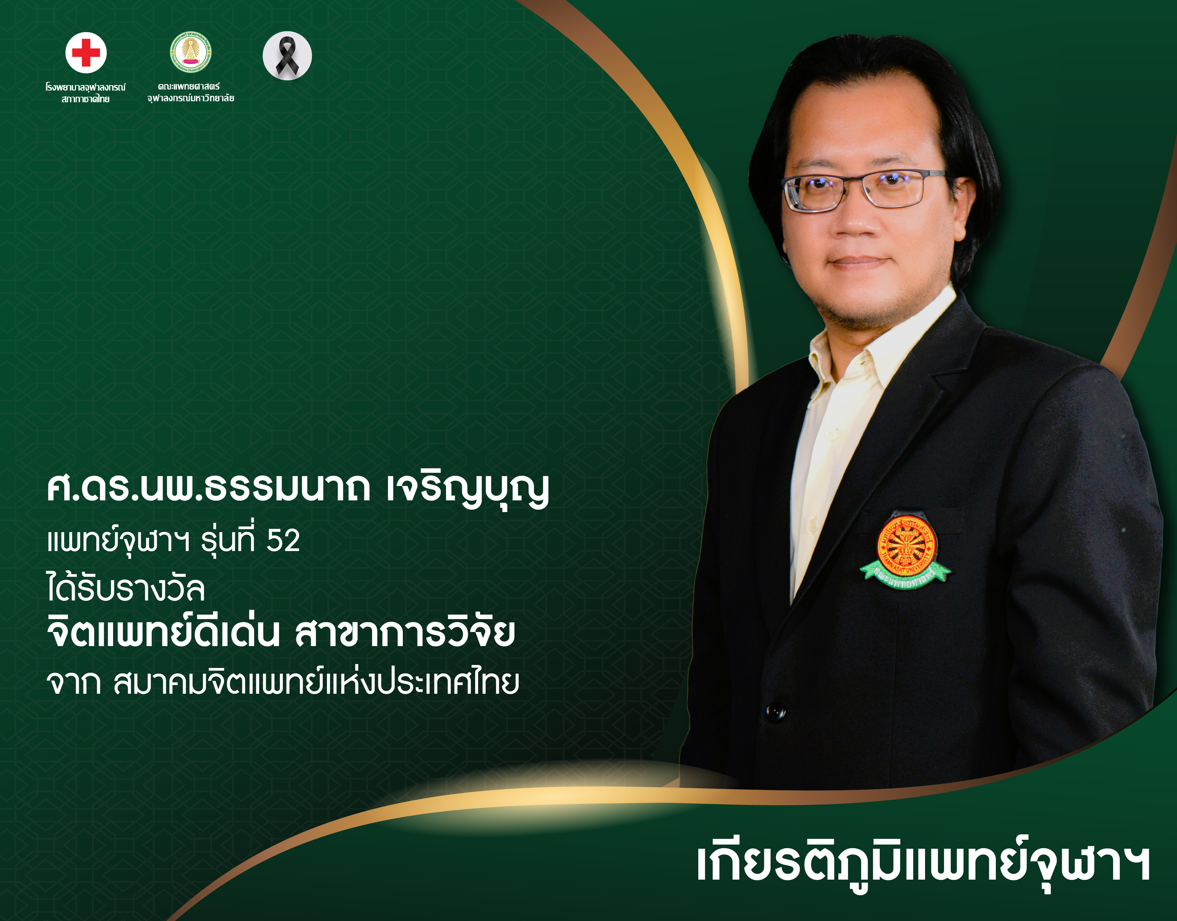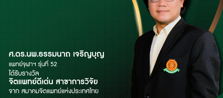 28 พ.ย. 2025 ศ.ดร.นพ.ธรรมนาถ เจริญบุญ แพทย์จุฬาฯ รุ่นที่ 52 ได้รับรางวัลจิตแพทย์ดีเด่น สาขาการวิจัย จากสมาคมจิตแพทย์แห่งประเทศไทย (เกียรติภูมิแพทย์จุฬาฯ) /Tags#mdcu, chula, chulalongkorn, medicine, คณะแพทยศาสตร์จุฬาลงกรณ์มหาวิทยาลัย, คณะแพทยศาสตร์จุฬาฯ, คณะแพทย์จุฬาฯ, เกียรติภูมิแพทย์จุฬาฯ, แพทย์จุฬาฯ กลับไปหน้าข่าวประชาสัมพันธ์