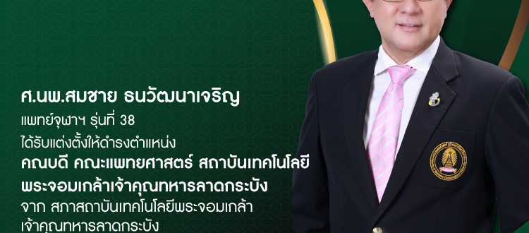 31 ต.ค. 2025 ศ.นพ.สมชาย ธนวัฒนาเจริญ แพทย์จุฬาฯ รุ่นที่ 38 ได้รับแต่งตั้งให้ดำรงตำแหน่งคณบดี คณะแพทยศาสตร์ สถาบันเทคโนโลยีพระจอมเกล้าเจ้าคุณทหารลาดกระบัง (เกียรติภูมิแพทย์จุฬาฯ) /Tags#mdcu, chula, chulalongkorn, medicine, คณะแพทยศาสตร์จุฬาลงกรณ์มหาวิทยาลัย, คณะแพทยศาสตร์จุฬาฯ, คณะแพทย์จุฬาฯ, เกียรติภูมิแพทย์จุฬาฯ, แพทย์จุฬาฯ กลับไปหน้าข่าวประชาสัมพันธ์
