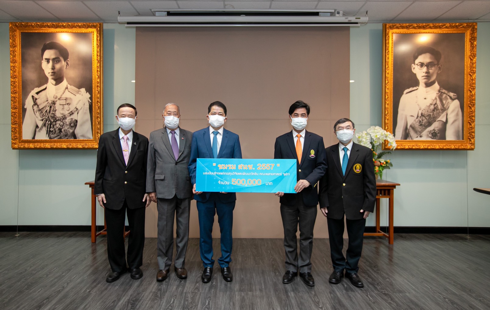 ศ.นพ.สุทธิพงศ์ วัชรสินธุ คณบดี คณะแพทยศาสตร์ จุฬาลงกรณ์มหาวิทยาลัย และศ.นพ.เกียรติ รักษ์รุ่งธรรม ผู้อำนวยการบริหารโครงการพัฒนาวัคซีนโควิด-19 ศูนย์วิจัยวัคซีน คณะแพทยศาสตร์ จุฬาลงกรณ์มหาวิทยาลัย รับมอบเงิน จำนวน 500,000 บาท (ห้าแสนบาทถ้วน) จาก นายประเสริฐ บุญสัมพันธ์ ประธานกรรมการชมรม สนช. 2557 พร้อมด้วย ศ.กิตติคุณ นพ.ภิรมย์ กมลรัตนกุล และนายศักดิ์ทิพย์ ไกรฤกษ์ ผู้แทนชมรม สนช. 2557 เพื่อสนับสนุนกองทุนการวิจัยและพัฒนาวัคซีน คณะแพทยศาสตร์ จุฬาลงกรณ์มหาวิทยาลัย