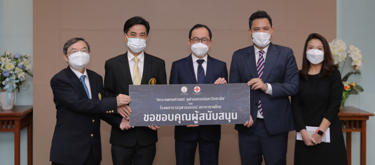ศ.นพ.สุทธิพงศ์ วัชรสินธุ คณบดี คณะแพทยศาสตร์ จุฬาลงกรณ์มหาวิทยาลัย พร้อมด้วย ศ.นพ.เกียรติ รักษ์รุ่งธรรม ผู้อำนวยการบริหารโครงการพัฒนาวัคซีนโควิด-19 ศูนย์วิจัยวัคซีน คณะแพทยศาสตร์ จุฬาลงกรณ์มหาวิทยาลัย รับมอบเงิน จำนวน 100,000 บาท (หนึ่งแสนบาทถ้วน) จาก นายคมกฤช เกียรติดุริยกุล กรรมการ ผู้แทนบริษัทเบเคอร์ แอนด์ แม็คเค็นซี่ จำกัด นายจารุพัฒน์ บุญ-หลง และน.ส.ชลธิชา อภินวถาวรกุล เพื่อสนับสนุนกองทุนการวิจัยและพัฒนาวัคซีน คณะแพทยศาสตร์ จุฬาลงกรณ์มหาวิทยาลัย
