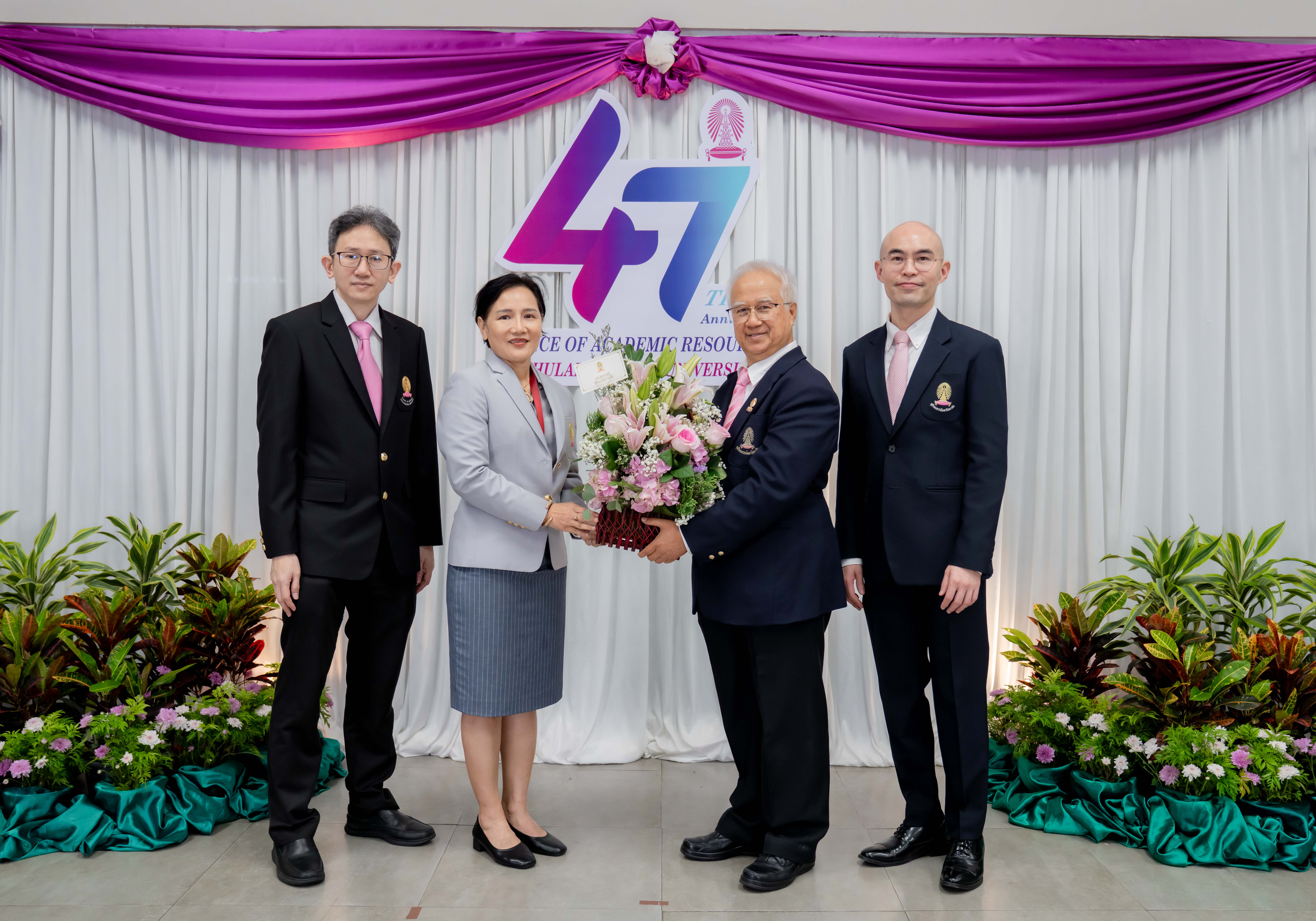 รศ.ดร.พญ.โสฬพัทธ์ เหมรัญช์โรจน์ รองคณบดีฝ่ายนวัตกรรมแนวบูรณาการและเทคโนโลยีดิจิทัล และ อ.ดร.นพ.วรพจน์ นิลรัตนกุล ผู้ช่วยคณบดีฝ่ายวิจัย คณะแพทยศาสตร์ จุฬาลงกรณ์มหาวิทยาลัย มอบกระเช้าดอกไม้และแสดงความยินดีเนื่องในโอกาสครบรอบ 47 ปีแห่งการสถาปนาสำนักงานวิทยทรัพยากร จุฬาลงกรณ์มหาวิทยาลัย โดยมี รศ.ดร.อมร เพชรสม ผู้อำนวยการสำนักงานวิทยทรัพยากร จุฬาลงกรณ์มหาวิทยาลัย ให้การต้อนรับ
