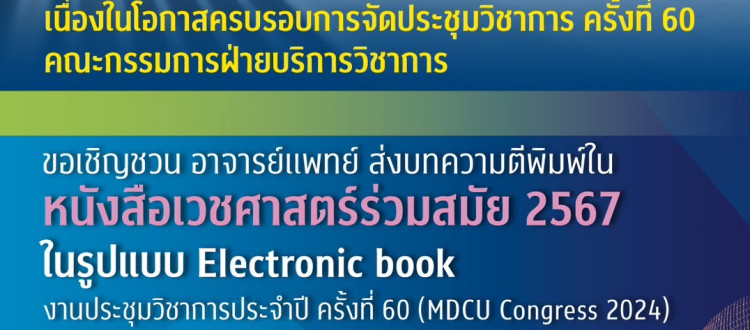 8 ก.ค. 2024 ขอเชิญชวน อาจารย์แพทย์ ส่งบทความตีพิมพ์ใน “หนังสือเวชศาสตร์ร่วมสมัย 2567” (ตั้งแต่วันนี้ถึง 19 กรกฎาคม 2567) /Tags#mdcu, chula, chulalongkorn, MDCUCONGRESS2024, medicine, คณะแพทยศาสตร์จุฬาลงกรณ์มหาวิทยาลัย, คณะแพทยศาสตร์จุฬาฯ, คณะแพทย์จุฬาฯ, แพทย์จุฬาฯ กลับไปหน้าข่าวประชาสัมพันธ์