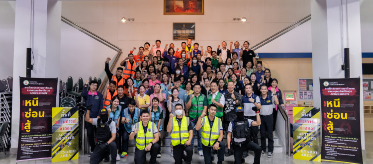 อ.นพ.ธนดล โรจนศานติกุล ผู้ช่วยคณบดีฝ่ายกายภาพ และ รศ.ดร.สรันยา เฮงพระพรหม ผู้ช่วยคณบดีฝ่ายกายภาพ คณะแพทยศาสตร์ จุฬาลงกรณ์มหาวิทยาลัย ร่วมต้อนรับ พล.ต.ต.ธีรชาติ ธีรชาติธำรง ผู้บังคับการปฏิบัติการพิเศษ พร้อมด้วย พ.ต.ท.ศราวุธ อยู่สบาย สว.กก. สายตรวจ บก.ปพ. ในฐานะหัวหน้าทีมวิทยากร และกำลังเจ้าหน้าที่ กก.สายตรวจ เนื่องในโอกาสบรรยายให้ความรู้และฝึกอบรมการเอาตัวรอดจากเหตุคนร้ายใช้อาวุธ (Active Shooter) “หนี ซ่อน สู้” และการช่วยเหลือผู้ได้รับบาดเจ็บจากเหตุคนร้ายใช้อาวุธในที่สาธารณะ เพื่อให้ผู้เข้าร่วมอบรมสามารถรับมือกับเหตุการณ์ได้อย่างเหมาะสม และลดความเสี่ยงจากการสูญเสียหากเกิดเหตุการณ์จริง จัดโดยงานบริหารระบบกายภาพ ฝ่ายบริหาร คณะแพทยศาสตร์ จุฬาลงกรณ์มหาวิทยาลัย