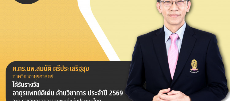 3 ก.พ. 2026 ศ.ดร.นพ.สมบัติ ตรีประเสริฐสุข ภาควิชาอายุรศาสตร์ ได้รับรางวัลอายุรแพทย์ดีเด่น ด้านวิชาการ ประจำปี 2569 (เกียรติภูมิแพทย์จุฬาฯ) /Tags#mdcu, chula, chulalongkorn, medicine, คณะแพทยศาสตร์จุฬาลงกรณ์มหาวิทยาลัย, คณะแพทยศาสตร์จุฬาฯ, คณะแพทย์จุฬาฯ, เกียรติภูมิแพทย์จุฬาฯ, แพทย์จุฬาฯ กลับไปหน้าข่าวประชาสัมพันธ์
