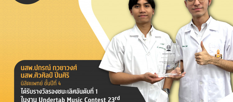 3 ก.พ. 2026 นสพ.ปกรณ์ กวยาวงศ์ และนสพ.ศิวศิลป์ ปิ่นศิริ นิสิตแพทย์ ชั้นปีที่ 4 ได้รับรางวัลรองชนะเลิศอันดับที่ 1 ในงาน Undertab Music Contest 23rd (เกียรติภูมิแพทย์จุฬาฯ) /Tags#mdcu, chula, chulalongkorn, medicine, คณะแพทยศาสตร์จุฬาลงกรณ์มหาวิทยาลัย, คณะแพทยศาสตร์จุฬาฯ, คณะแพทย์จุฬาฯ, เกียรติภูมิแพทย์จุฬาฯ, แพทย์จุฬาฯ กลับไปหน้าข่าวประชาสัมพันธ์