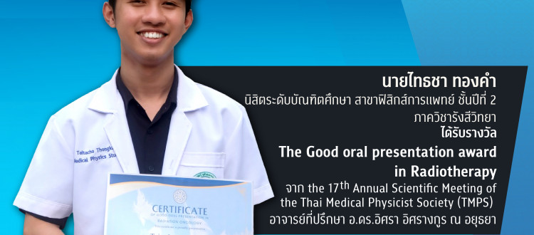 นายไทธชา ทองคำ นิสิตระดับบัณฑิตศึกษา สาขาฟิสิกส์การแพทย์ ชั้นปีที่ 2 ภาควิชารังสีวิทยา ได้รับรางวัล The Good oral presentation award in Radiotherapy จาก the 17th Annual Scientific Meeting of the Thai Medical Physicist Society (TMPS) (เกียรติภูมิแพทย์)