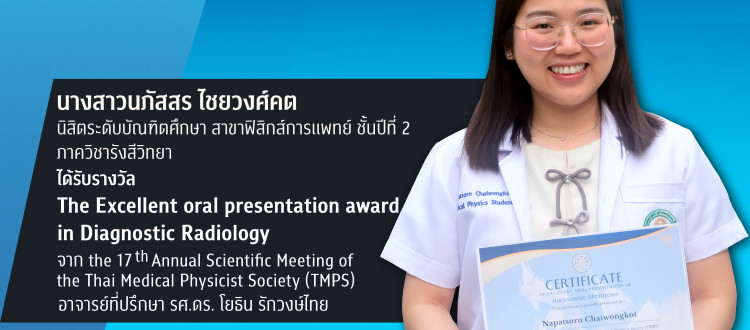 นางสาวนภัสสร ไชยวงศ์คต นิสิตระดับบัณฑิตศึกษา สาขาฟิสิกส์การแพทย์ ชั้นปีที่ 2 ภาควิชารังสีวิทยา ได้รับรางวัล The Excellent oral presentation award in Diagnostic Radiology จาก the 17th Annual Scientific Meeting of the Thai Medical Physicist Society (TMPS) (เกียรติภูมิแพทย์จุฬาฯ))