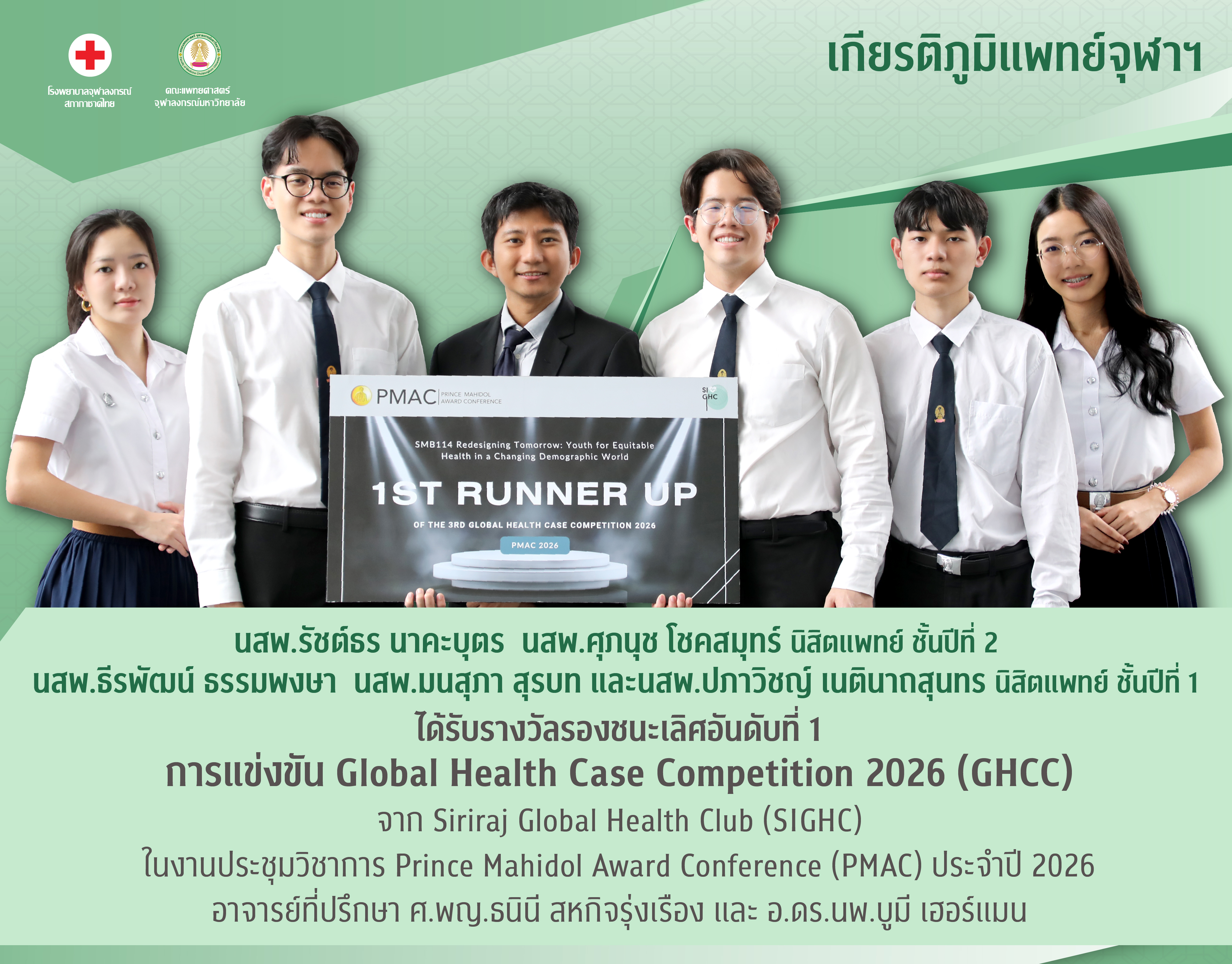 24 มี.ค. 2026 รางวัลรองชนะเลิศอันดับที่ 1 การแข่งขัน Global Health Case Competition 2026 (GHCC) จาก Siriraj Global Health Club (SIGHC) (เกียรติภูมิแพทย์จุฬาฯ) /Tags#mdcu, chula, chulalongkorn, medicine, คณะแพทยศาสตร์จุฬาลงกรณ์มหาวิทยาลัย, คณะแพทยศาสตร์จุฬาฯ, คณะแพทย์จุฬาฯ, เกียรติภูมิแพทย์จุฬาฯ, แพทย์จุฬาฯ กลับไปหน้าข่าวประชาสัมพันธ์