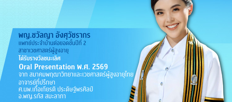10 เม.ย. 2026 พญ.ชวัลญา อังศุวัชรากร แพทย์ประจำบ้านต่อยอด ชั้นปีที่ 2 สาขาเวชศาสตร์ผู้สูงอายุ ภาควิชาอายุรศาสตร์ ได้รับรางวัลชนะเลิศ Oral Presentation พ.ศ. 2569 (เกียรติภูมิแพทย์จุฬาฯ) /Tags#mdcu, chula, chulalongkorn, medicine, คณะแพทยศาสตร์จุฬาลงกรณ์มหาวิทยาลัย, คณะแพทยศาสตร์จุฬาฯ, คณะแพทย์จุฬาฯ, เกียรติภูมิแพทย์จุฬาฯ, แพทย์จุฬาฯ กลับไปหน้าข่าวประชาสัมพันธ์