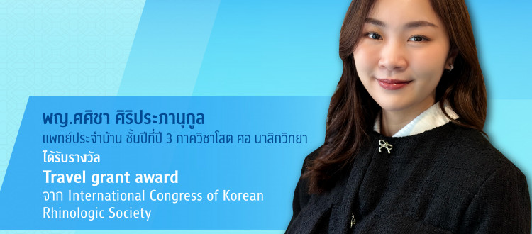 10 เม.ย. 2026 พญ.ศศิชา ศิริประภานุกูล แพทย์ประจำบ้าน ชั้นปีที่ปี 3 ภาควิชาโสต ศอ นาสิกวิทยา ได้รับรางวัล Travel grant award จาก International Congress of Korean Rhinologic Society (เกียรติภูมิแพทย์จุฬาฯ) /Tags#mdcu, chula, chulalongkorn, medicine, คณะแพทยศาสตร์จุฬาลงกรณ์มหาวิทยาลัย, คณะแพทยศาสตร์จุฬาฯ, คณะแพทย์จุฬาฯ, เกียรติภูมิแพทย์จุฬาฯ, แพทย์จุฬาฯ กลับไปหน้าข่าวประชาสัมพันธ์
