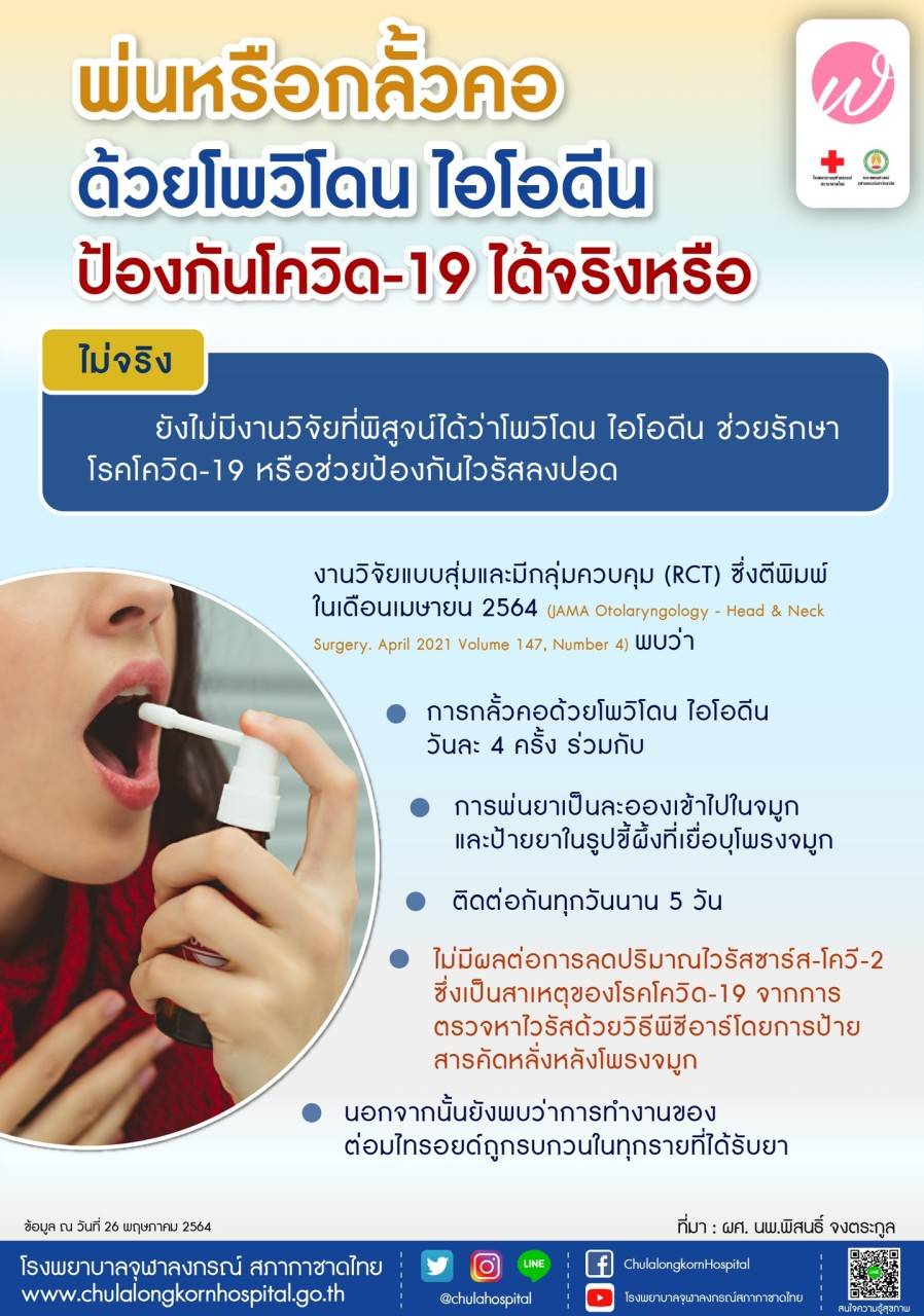 26 พ.ค. 2021 😷…พ่นหรือกลั้วคอ ด้วยโพวิโดน ไอโอดีน ป้องกันโควิด-19 ได้จริงหรือ…👇 /Tags#mdcu, chula, ChulaCov19, chulalongkorn, Covid19, medicine, คณะแพทยศาสตร์จุฬาลงกรณ์มหาวิทยาลัย, คณะแพทยศาสตร์จุฬาฯ, คณะแพทย์จุฬาฯ, วัคซีนโควิด, แพทย์จุฬาฯ, โควิด19 กลับไปหน้าข่าวประชาสัมพันธ์