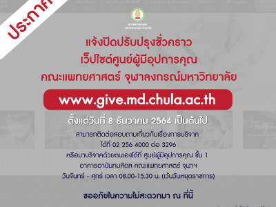 แจ้งปิดปรับปรุงชั่วคราวเว็บไซต์ศูนย์ผู้มีอุปการคุณ คณะแพทยศาสตร์ จุฬาลงกรณ์มหาวิทยาลัย ตั้งแต่วันที่ 8 ธันวาคม 2564 เป็นต้นไป Posted on08 ธ.ค. 2021Tags#mdcu, chula, chulalongkorn, medicine, คณะแพทยศาสตร์จุฬาลงกรณ์มหาวิทยาลัย, คณะแพทยศาสตร์จุฬาฯ, คณะแพทย์จุฬาฯ, แพทย์จุฬาฯ