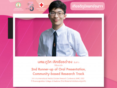 นสพ.ภูวิศ เลิศเธียรดำรง นิสิตแพทย์ ชั้นปีที่ 5 ได้รับรางวัล 2nd Runner-up of Oral Presentation, Community-based Research Track Posted on31 มี.ค. 2022