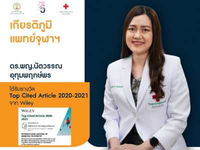 ดร.พญ.นัตวรรณ อุทุมพฤกษ์พร ได้รับรางวัล Top Cited Article 2020 – 2021 จาก Wiley Posted on12 ก.ค. 2022Tags#mdcu, chula, chulalongkorn, medicine, คณะแพทยศาสตร์จุฬาลงกรณ์มหาวิทยาลัย, คณะแพทยศาสตร์จุฬาฯ, คณะแพทย์จุฬาฯ, เกียรติภูมิแพทย์จุฬาฯ, แพทย์จุฬาฯ