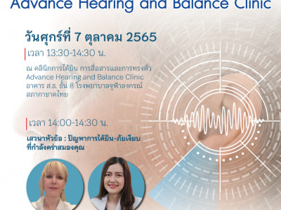 งานแถลงข่าวเปิดตัวคลินิกการได้ยินและการทรงตัวขั้นสูง Advance Hearing and Balance Clinic Posted on05 ต.ค. 2022Tags#mdcu, chula, chulalongkorn, medicine, คณะแพทยศาสตร์จุฬาลงกรณ์มหาวิทยาลัย, คณะแพทยศาสตร์จุฬาฯ, คณะแพทย์จุฬาฯ, แพทย์จุฬาฯ