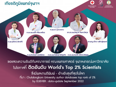 คณะแพทยศาสตร์ จุฬาฯ ขอแสดงความยินดีกับคณาจารย์ คณะแพทยศาสตร์ จุฬาลงกรณ์มหาวิทยาลัย ในโอกาสที่ ติดอันดับ World’s Top 2% Scientists Posted on28 ต.ค. 2022Tags#mdcu, chula, chulalongkorn, medicine, คณะแพทยศาสตร์จุฬาลงกรณ์มหาวิทยาลัย, คณะแพทยศาสตร์จุฬาฯ, คณะแพทย์จุฬาฯ, เกียรติภูมิแพทย์จุฬาฯ, แพทย์จุฬาฯ
