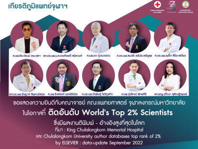 คณะแพทยศาสตร์ จุฬาฯ ขอแสดงความยินดีกับคณาจารย์ คณะแพทยศาสตร์ จุฬาลงกรณ์มหาวิทยาลัย ในโอกาสที่ ติดอันดับ World’s Top 2% Scientists ซึ่งมีผลงานตีพิมพ์ – อ้างอิงสูงที่สุดในโลก Posted on02 พ.ย. 2022Tags#mdcu, chula, chulalongkorn, medicine, คณะแพทยศาสตร์จุฬาลงกรณ์มหาวิทยาลัย, คณะแพทยศาสตร์จุฬาฯ, คณะแพทย์จุฬาฯ, เกียรติภูมิแพทย์จุฬาฯ, แพทย์จุฬาฯ