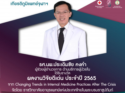 คณะแพทยศาสตร์ จุฬาฯ ขอแสดงความยินดีกับ รศ.นพ.ประเดิมชัย คงคำ ผู้ช่วยผู้อำนวยการ ด้านบริการผู้ป่วยใน ได้รับรางวัลผลงานวิจัยดีเด่น ประจำปี 2565 Posted on09 ม.ค. 2023Tags#mdcu, chula, chulalongkorn, medicine, คณะแพทยศาสตร์จุฬาลงกรณ์มหาวิทยาลัย, คณะแพทยศาสตร์จุฬาฯ, คณะแพทย์จุฬาฯ, แพทย์จุฬาฯ