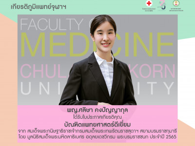 🎉 คณะแพทยศาสตร์ จุฬาฯ ขอแสดงความยินดีกับ พญ.ศลิษา คงปัญญากุล ได้รับใบประกาศเกียรติคุณ บัณฑิตแพทยศาสตร์ดีเยี่ยม จาก สมเด็จพระกนิษฐาธิราชเจ้า กรมสมเด็จพระเทพรัตนราชสุดาฯ สยามบรมราชกุมารี Posted on22 พ.ค. 2023Tagschula, chulalongkorn, medicine, คณะแพทยศาสตร์จุฬาลงกรณ์มหาวิทยาลัย, คณะแพทยศาสตร์จุฬาฯ, คณะแพทย์จุฬาฯ, เกียรติภูมิแพทย์จุฬาฯ, แพทย์จุฬาฯ